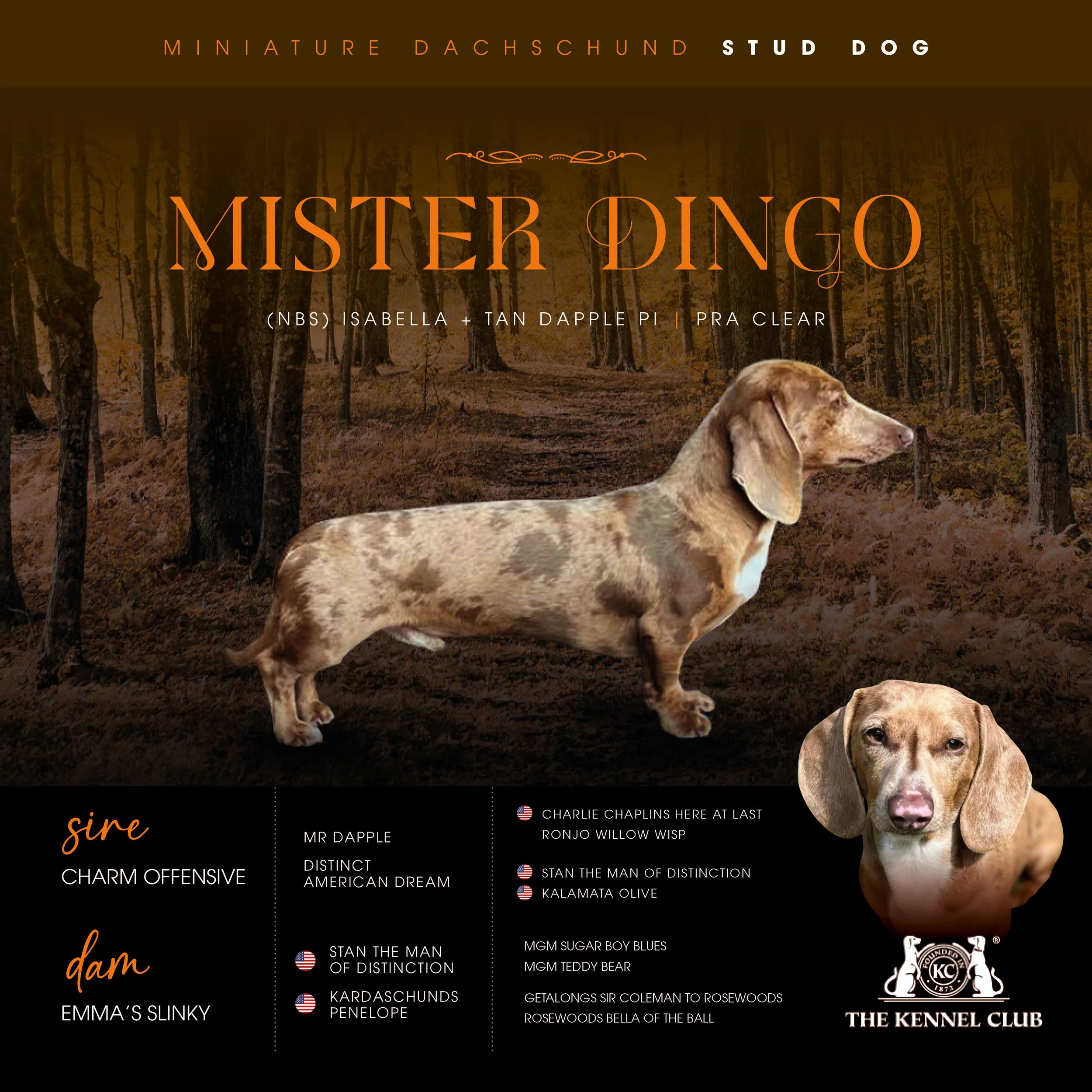 A sharp, playful promo graphic to advertise the stud services of this miniature dachschund.