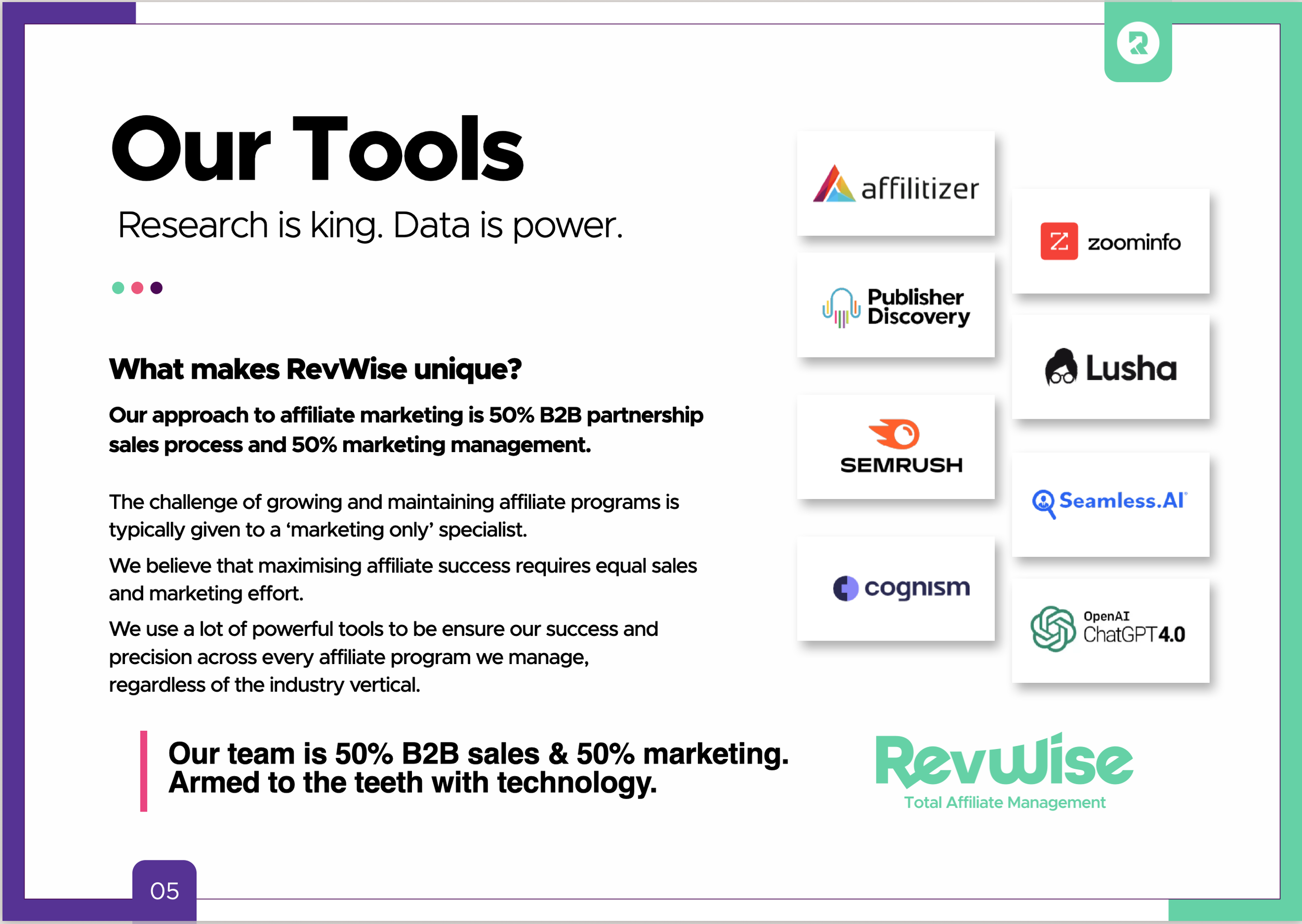 We partnered with The FUSE Collective to support RevWise; an affiliate management superpower, with branding, website direction, and sales materials. Our contributions included tagline refinement, visual research, and the creation of a polished proposal deck. Though the site has since evolved, elements of our work still influence the brand’s visual identity.